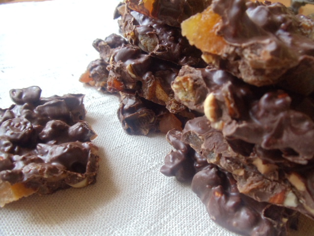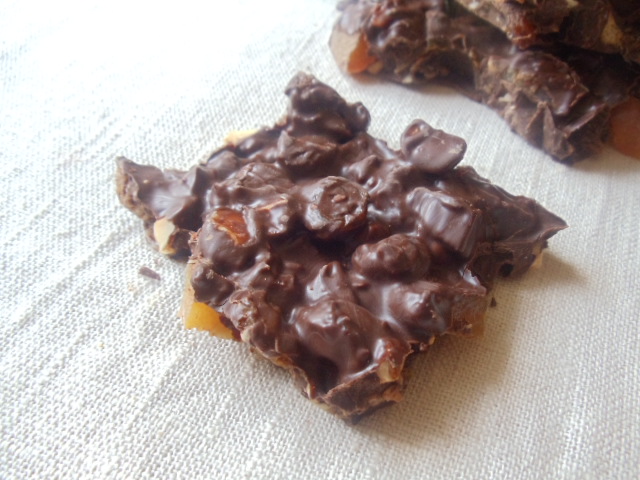 - Früchte-Nüssemischung mit schmelzende Schokolade mischen. Ein Blech mit Backpapier auslegen, die Schokomasse daraufgiessen und mit einem Löffelrücken gleichmäsig verstreichen. An einem kühlen Ort 30 Min. fest werden lassen.
