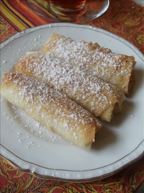 - Yufka auf dem Arbeitsplatte vierteln, jedes Stück nochmal halbieren. In der Mitte eckige Yufkastücken je mit 1 Eßlöffel Apfelmischung füllen. Bis zr Spitze ausrollen. Spitze mit etwas Wasser nässen und damit Börek zudecken. Wenn alle Böreks fertig sind in eine mittelgrösse Pfanne, Pflanzenöl bei mittlerer Hitze erhitzen. Die Böreks darin rundum goldbraun braten. Auf einem Küchentuch entölen. Lauwarm oder kalt servieren.