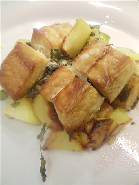 Kartoffeln und Zucchini schälen, in 1 cm grosse Würfel schneiden. Gelbe und rote Paprika waschen, halbieren, entkernen. Die ebenfalls in kleine Würfel schneiden. In einem Rührschüssel Paprika, Kartoffeln, Zucchini, übrige feingehackte Kräuter, Salz, Pfeffer und ca. 3-4 EL Olivenöl mischen. Die Gemüsemischung neben Fisch verteilen und weiter ca. 40 Minuten backen. Noch heiss servieren.