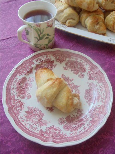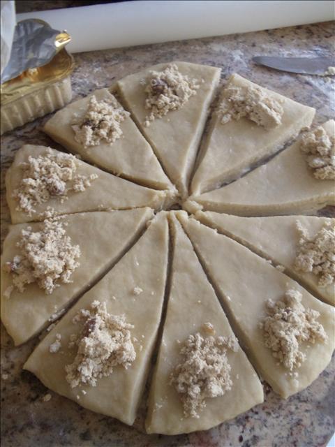 - Den Teig 40-45 cm Durchmesser ausrollen. Mit einem Messer einmal halbieren, jedes Stück in fünf Dreiecke schneiden. Jedes Stück mit 1 EL Helva füllen und rollen und zwei Spitze etwas annähern. Auf dem Backblech mit etwas Abstand nebeneinander legen. Eigelb mit 1 Kaffeelf. Wasser verdünnen und damit alle Gebäck bestreichen. Im vorgeheizte Backofen ca. 15-20 Minuten goldbraun backen.
