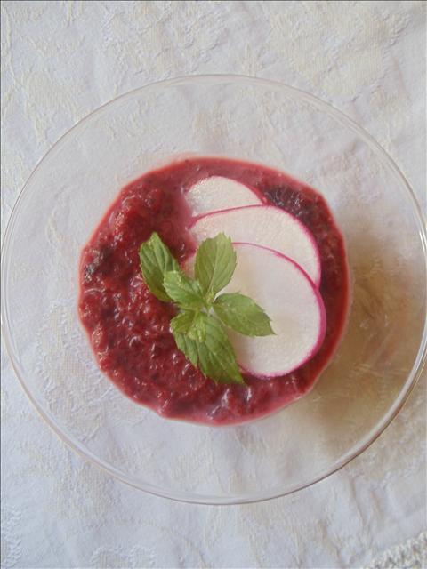 - Rote Bete mit Sahne, Milch und Zucker fein pürieren. In eine Schälchen füllen, kalt stellen.
